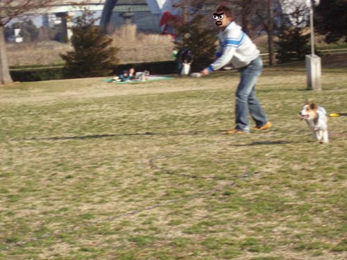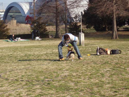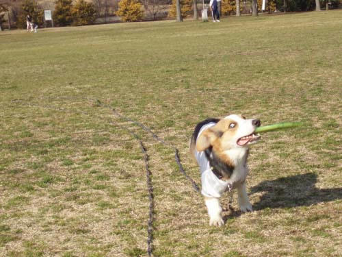 とりあえず、大きな公園で、ロングリードを使ってのフリスビーから